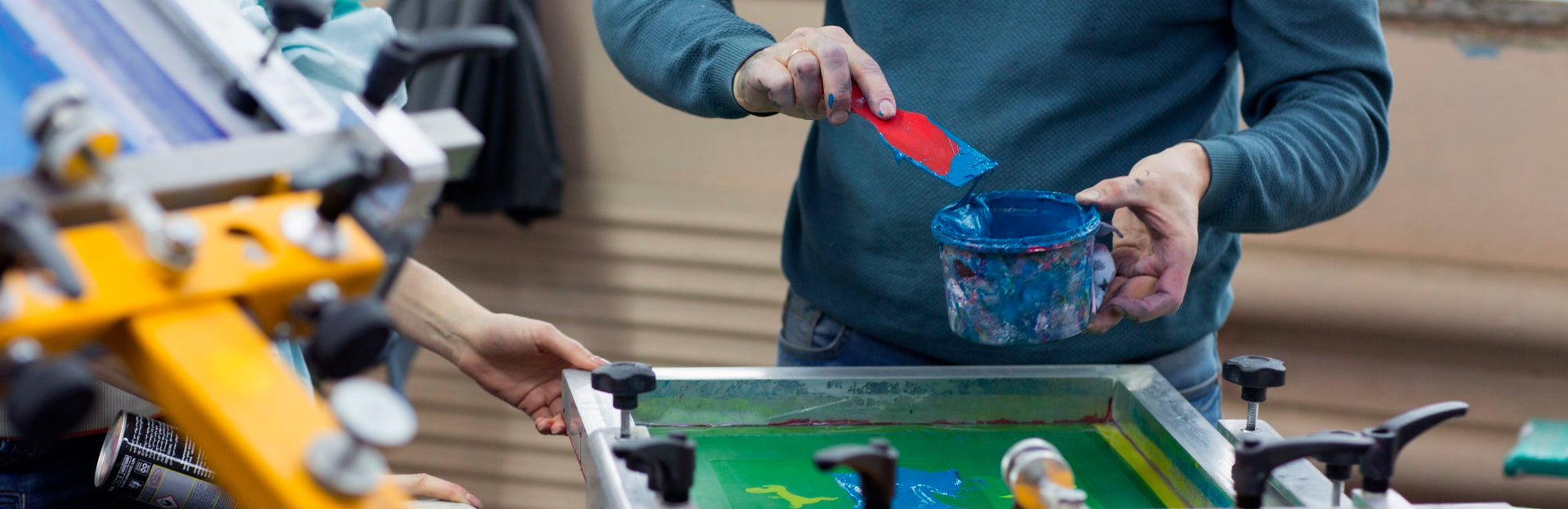 Screen printing is a way to print designs using a special mesh screen and ink. It works by putting a stencil on the screen that blocks ink in certain areas. When you press ink through the mesh, only the parts that aren't blocked by the stencil get printed onto the material you're using. This can be anything like t-shirts, posters, or wood. You use a tool called a squeegee to push the ink through the mesh and onto your material.